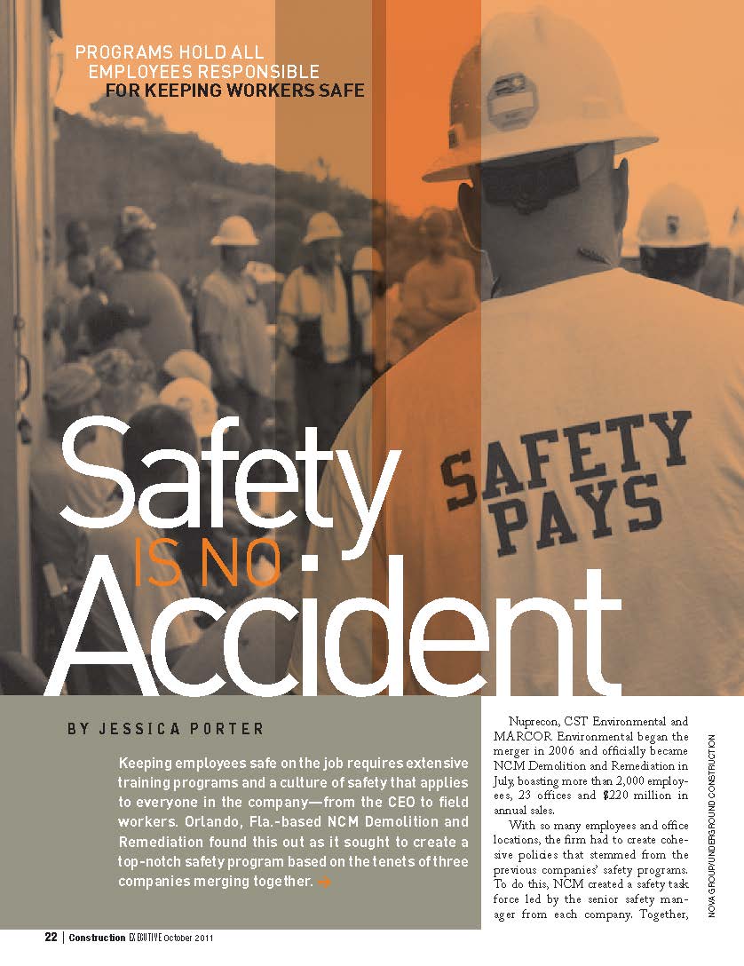 Safety is No Accident March 14, 2015 Leave a Comment Construction Executive, October 2011 Credit: Construction Executive Email porterjl2@gmail.com for full article. Share this: Click to share on X (Opens in new window) X Click to share on Facebook (Opens in new window) Facebook Like Loading... Related Construction Executive, Magazines 2011, Construction Executive, October 2011