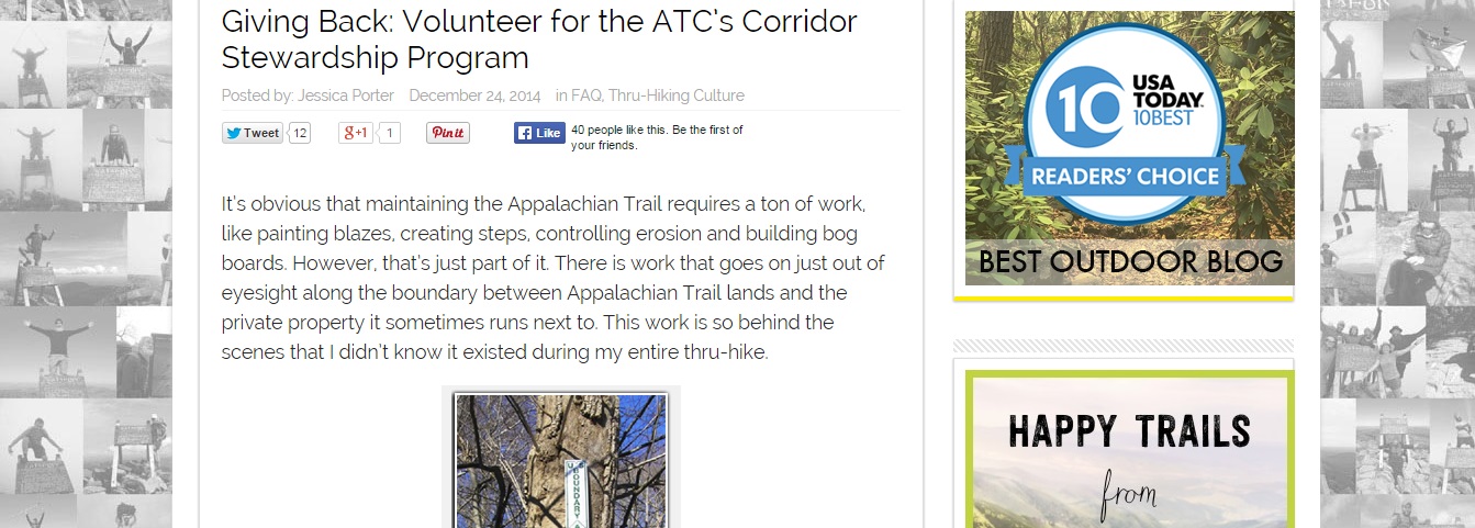 Giving Back: Volunteer for the ATC’s Corridor Stewardship Program March 15, 2015 Leave a Comment Appalachian Trials, December 2014 Credit: Appalachian Trials Share this: Share on X (Opens in new window) X Share on Facebook (Opens in new window) Facebook Like Loading... Related Appalachian Trials, Web 2014, Appalachian Trials, December 2014