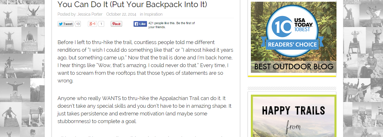 You Can Do It (Put Your Backpack Into It) March 16, 2015 Leave a Comment Appalachian Trials, October 2014 Credit: Appalachian Trials Share this: Click to share on X (Opens in new window) X Click to share on Facebook (Opens in new window) Facebook Like Loading... Related Appalachian Trials, Web Appalachian Trials, October 2014