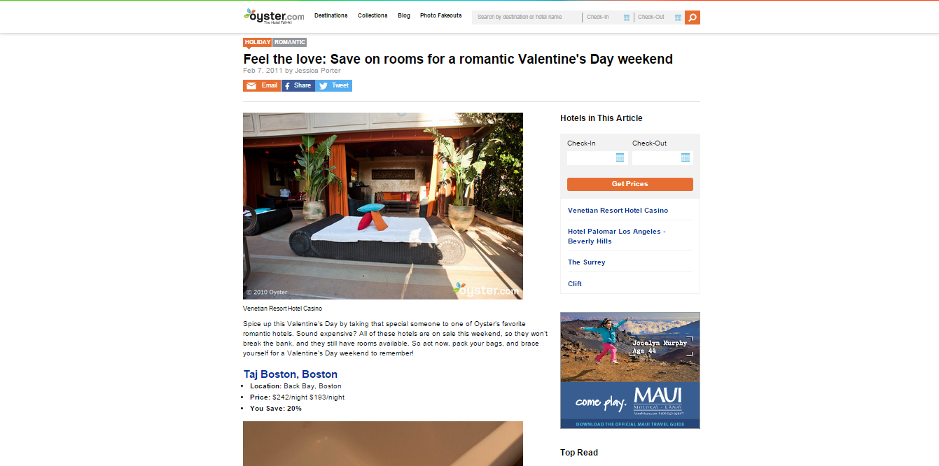 Feel the Love: Save on Rooms for a Romantic Valentine’s Day Weekend June 4, 2015 Leave a Comment Oyster.com, February 2011 Oyster.com Share this: Click to share on X (Opens in new window) X Click to share on Facebook (Opens in new window) Facebook Like Loading... Related Oyster, Web 2011, February 2011, Oyster