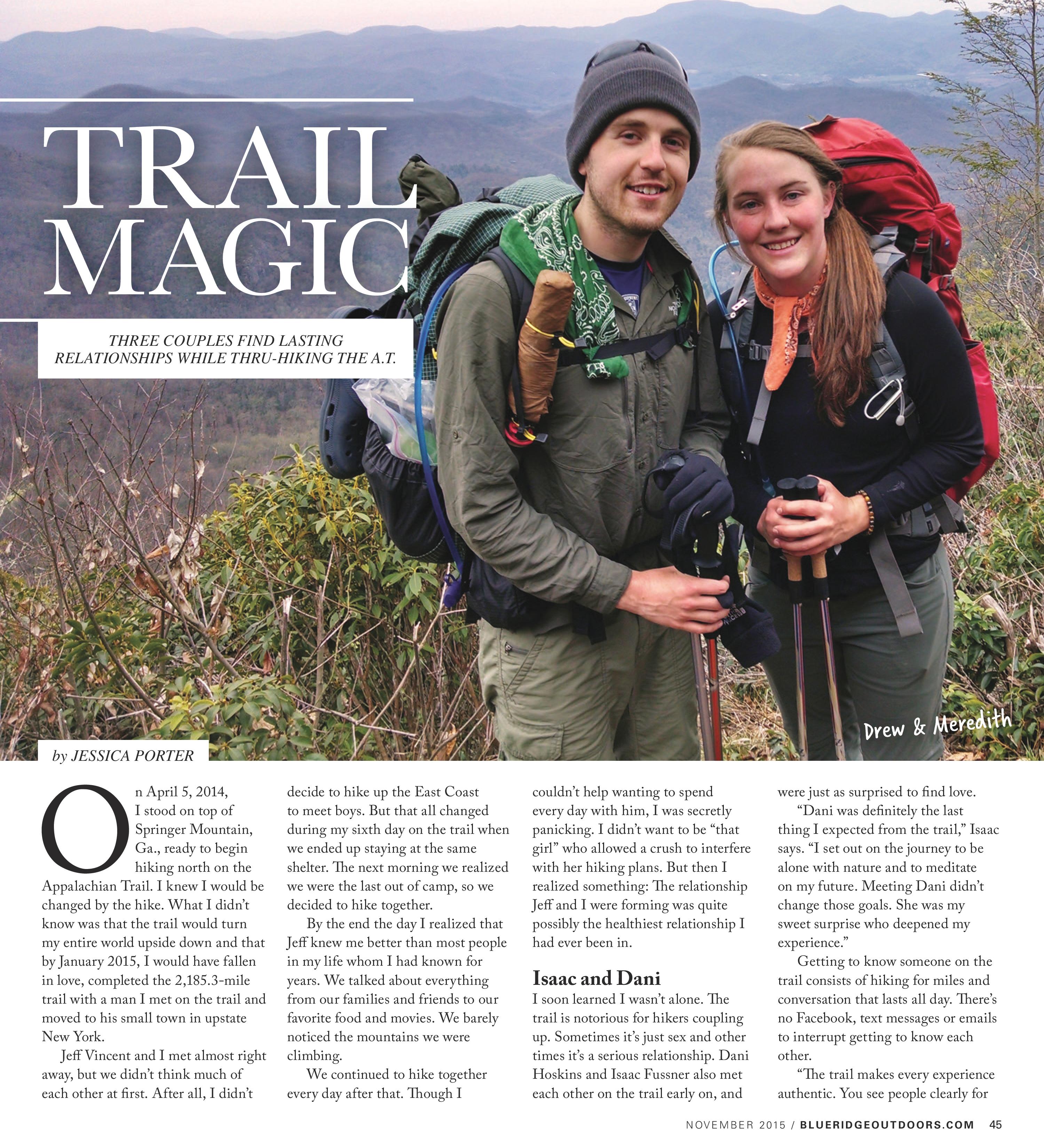 Trail Magic: Three Couples Find Lasting Relationships While Thru-Hiking the A.T. November 20, 2015 Leave a Comment November 2015, Blue Ridge Outdoors Share this: Click to share on X (Opens in new window) X Click to share on Facebook (Opens in new window) Facebook Like Loading... Related Blue Ridge Outdoors, Magazines 2015, Blue Ridge Outdoors, November 2015