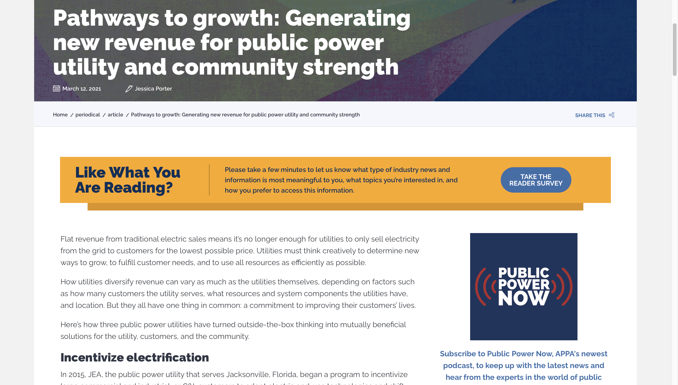 Pathways to Growth: Generating New Revenue for Public Power Utility and Community Strength November 25, 2022 March 2021, Public Power Click here to read the entire article. Share this: Click to share on X (Opens in new window) X Click to share on Facebook (Opens in new window) Facebook Like Loading... Related Magazines, Portfolio, Public Power 2021, Public Power