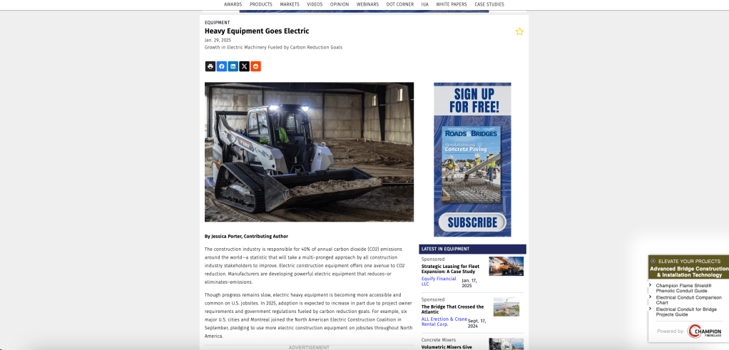 Heavy Equipment Goes Electric January 29, 2025 January 2025, Roads & Bridges Click here to read the entire article. Share this: Click to share on X (Opens in new window) X Click to share on Facebook (Opens in new window) Facebook Like Loading... Related Magazines, Portfolio, Roads & Bridges 2025, Roads & Bridges