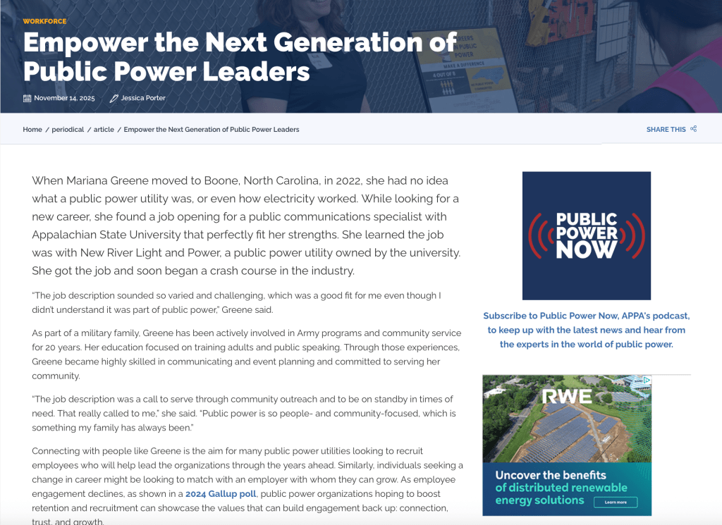 Empower the Next Generation of Public Power Leaders 3 weeks ago Public Power, November 2025 Click here to read the entire article. Share this: Click to share on X (Opens in new window) X Click to share on Facebook (Opens in new window) Facebook Like Loading... Related Magazines, Portfolio, Public Power 2025, Public Power