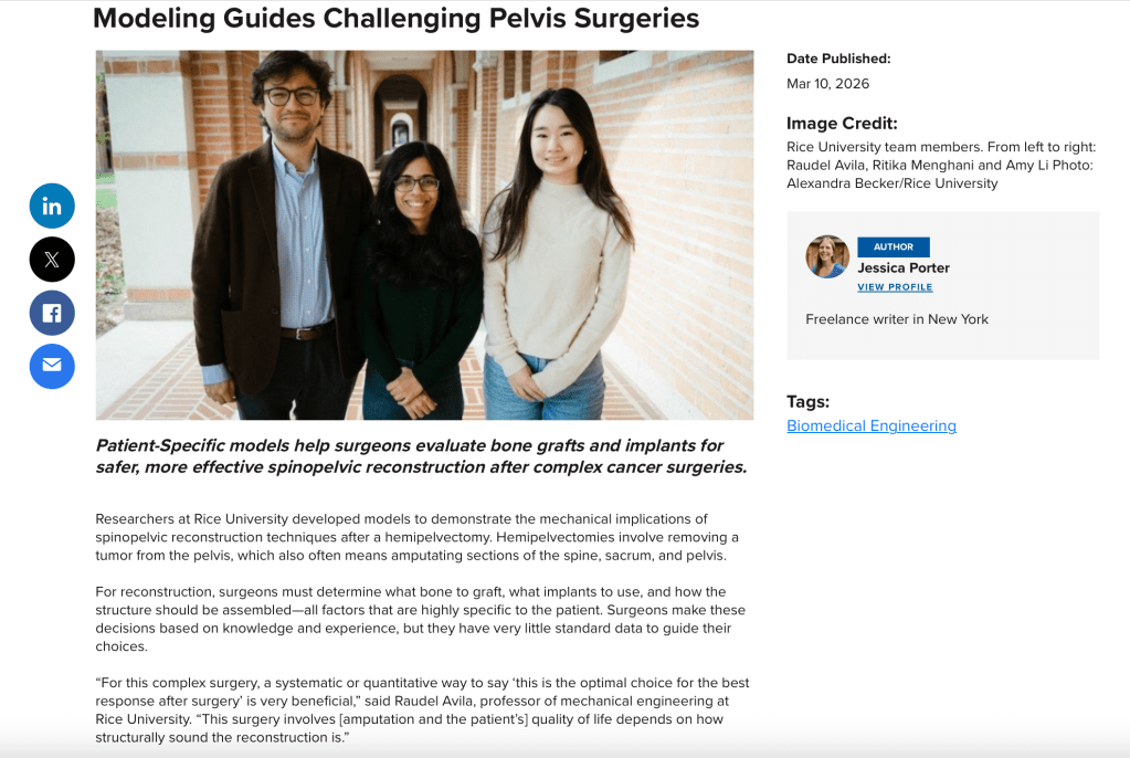 Modeling Guides Challenging Pelvis Surgeries 1 day ago ASME, March 2026Click here to read the article. Share this: Share on X (Opens in new window) X Share on Facebook (Opens in new window) Facebook Like Loading... Related Web, Portfolio, American Society of Mechanical Engineers ASME, 2026, March 2026