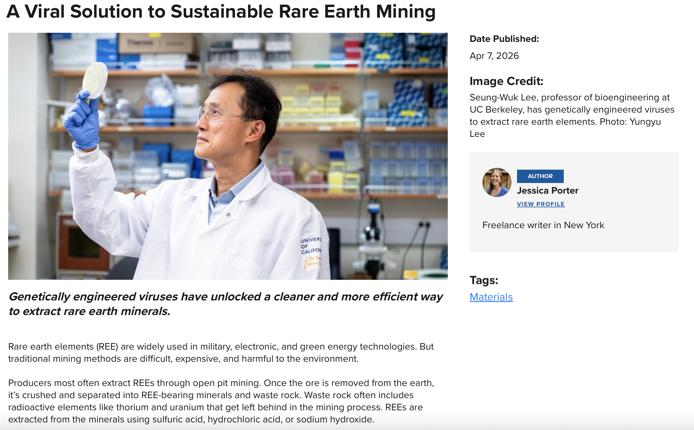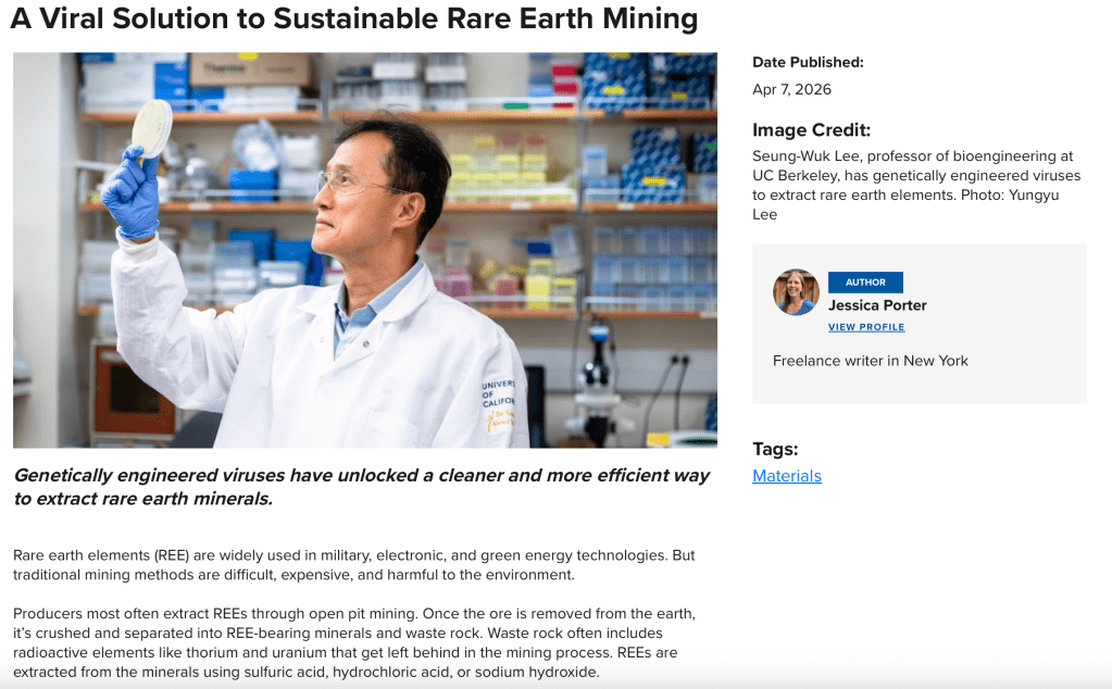 A Viral Solution to Sustainable Rare Earth Mining 2 hours ago ASME, April 2026 Click here to read the entire article. Share this: Share on X (Opens in new window) X Share on Facebook (Opens in new window) Facebook Like Loading... Related American Society of Mechanical Engineers, Portfolio, Web 2026, April 2026, ASME